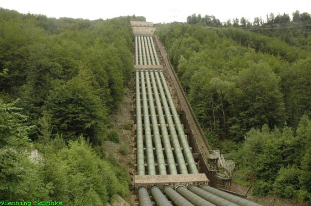 Auch sonst kann man sich frei und ohne Eintritt zu bezahlen in den zugänglichen Bereichen bewegen. Neben der Kraftwerkshalle kommen die Fallrohre vom Kesselberg herunter.