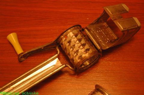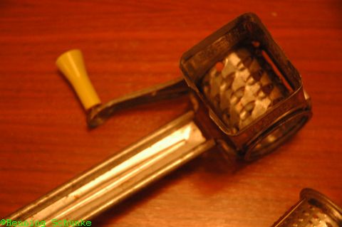 Boah, Flashback! Meine Oma hatte so einen, ich hab schon als kleines Kind damit hantiert und Schokolade zu Raspeln verarbeitet. Bei der Haushaltsauflösung hat mein Vater das Teil garantiert weggeschmissen, genau wie die alte Küchenwaage, die Handkurbel-Kaffeemühle und viele andere alte Sachen. *heul*
