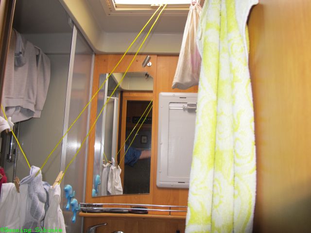 ich liebe Improvisationen, wenn man gezwungen ist, mit vorhandenen Mitteln ein akutes Problem zu lösen. So war es gestern mit der Wäsche, die noch feucht aus dem Campingplatztrockner kam. Den Trockenboden im Fahrerhaus habt ihr ja schon bewundert. Im Bad musste ich auch noch einiges aufhängen, auch hier gänzlich ohne Befestigungspunkte für eine Wäscheleine.