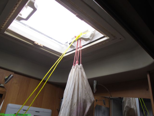 Der Beutel am Ende der gelben Leine ist das Gegengewicht zur Wäsche. Da sind ein paar Bad-Utensilien drin. Oben läuft die Leine durch den Griff der Dachluke. So ist natürlich das Bad mit Wasche blockiert. Hebe ich aber den Beutel an…