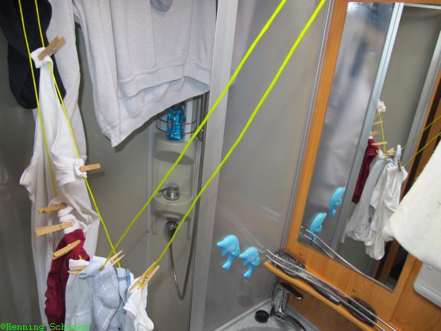Vielleicht regt das den einen oder anderen von Platzmangel geplagten Rumtreiber zu neuen Basteleien an. Während der Fahrt wird der pendelnde Beutel wohl einigen Krach machen. Das soll auch keine Dauerlösung sein, ich werde nach einer kleinen Wäschespinne suchen, die ich in die Dusche hängen kann.