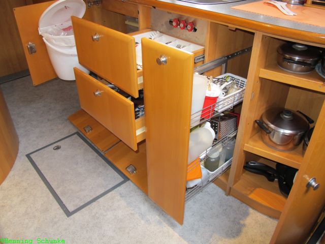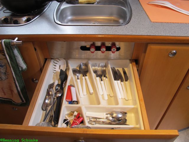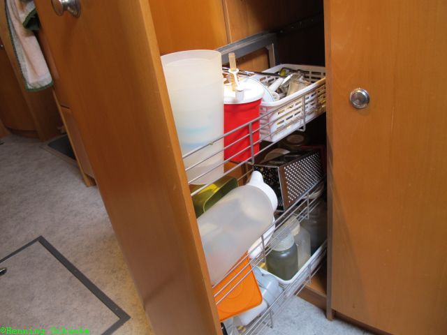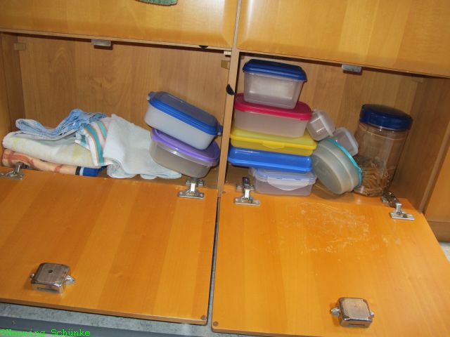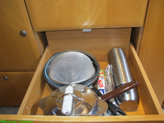In diese Schublade sollen später Vorräte. Wenn ihr meint, dass ich viel zu viele Töpfe und Pfannen habe, dann habt ihr recht. Ich will das alles mit nach Hause nehmen und mir dort die besten Teile fürs WoMo aussuchen.