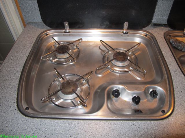Der Herd hat drei Flammen und Piezozündung. Meinen altbewährten Gasanzünder werde ich trotzdem behalten, man weiß ja nie.