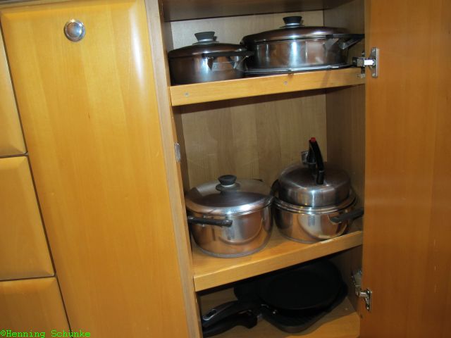 Mutters 40 Jahre alten WMF-Töpfe und ihre Bratpfannen haben hier einen würdigen Platz gefunden. Die Töpfe sind relativ leicht und unkaputtbar, darum sollen die auf ihre alten Tage auf Reisen gehen: