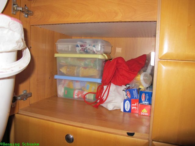 Die offenen Fächer beherbergen zur Zeit, von oben nach unten: Gewürze, Zerbrechliches möglichst fest verkeilt und allgemeines Geraffel, das noch keinen anderen Platz hat.