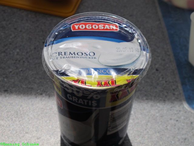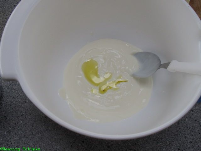 Während die im Wasser auf kleiner Stufe langsam gar werden, kommt ein Spritzer Olivenöl an 4-5 Esslöffel Joghurt: