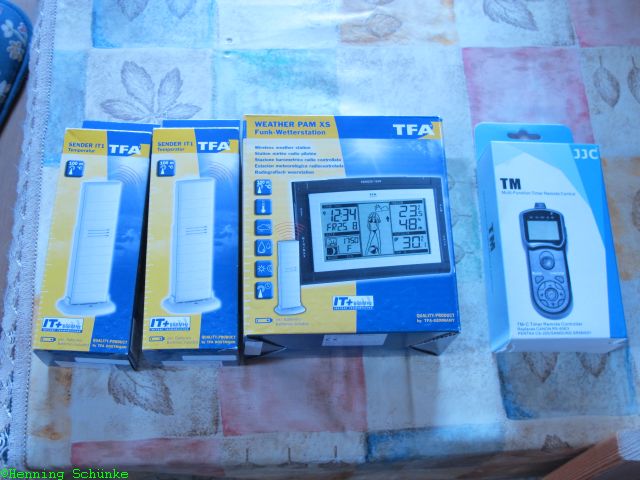 Links zwei Temperaturfühler *, in der Mitte die zugehörige Wetterstation *