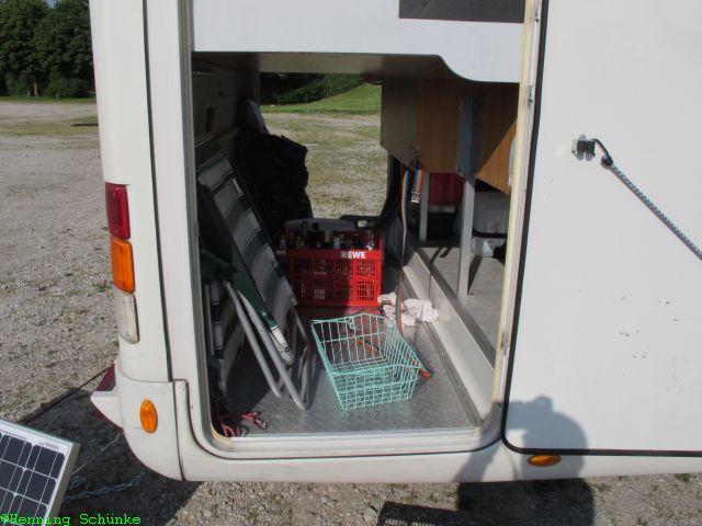 das ist die nächste größere Baustelle. Im Moment kann ich darin nur alles stapeln, aber nichts aufhängen oder Einzelteile schnell erreichbar verstauen. Viele haben darin richtige Regalsysteme und ganze Kistenbatterien. Aber die haben auch eine größere Heckgarage, weil die unter einem Heckbett liegt. Bei mir ist sie etwas kleiner durch die Hecksitzgruppe, aber bei sinnvoller Organisation sicherlich groß genug. So sieht sie im Moment aus von rechts…