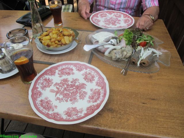 Es gibt Aal in Gelee, Brathering und Matjes mit Bratkartoffeln. Sehr lecker.