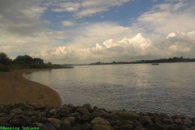 Als der Regen eine Pause macht, geht es mit dem Fahrrad los. Die Regenpause dauert allerdings nicht sehr lange. Aber hier ist der Rhein, sogar mit Sandstrand, doch es schüttet ganz kräftig.