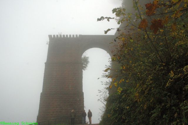 Bis zu der vom Parkplatz aus gesehenen Kanzel habe ich es geschafft, bin dann aber doch wieder umgedreht, aus Sorge, man könnte mich hier oben einschließen. Der Blick von der Kanzel hat durch den Nebel etwas gelitten, aber die Burg war noch gut zu sehen.
