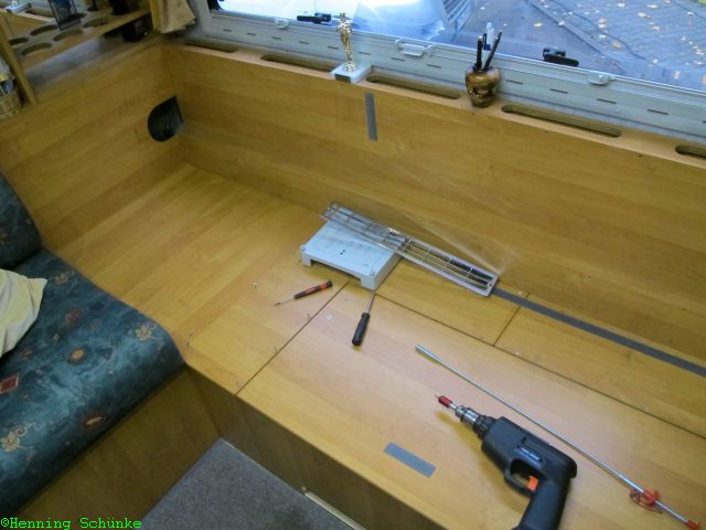 Am Ende haben wir uns den Strom in der Verteilung unter der linken Seitensitzbank geholt, das Kabel ein Stück weit durch dieses Wollmäuseversteck geführt…