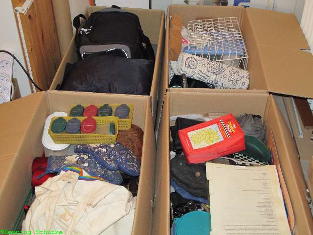 Die erste Jahreshälfte 2013 bestand aus Räumen und Aussortieren. Mit dem Inhalt des alten Benz fing es an. Hier fast der ganze mobile Hausstand, verteilt auf vier Umzugskartons.
