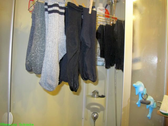 Während der Fahrt habe ich meine Socken in Waschlauge eingelegt, jetzt hängen sie in der Dusche zum Trocknen…
