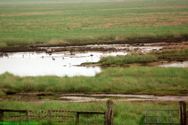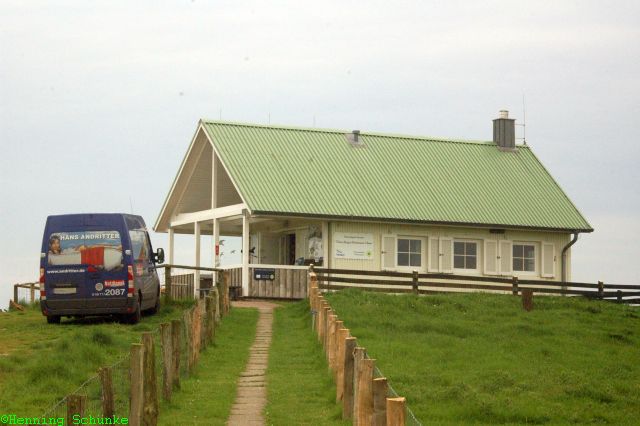 Die Hallig ist eher eine Halbinsel, ganz überwiegend aus Salzwiesen bestehend. Aber rund dreißig Mal im Jahr steht hier doch noch alles unter Wasser. Die einzige Warft ist acht Meter hoch.
