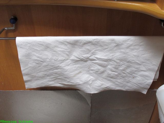 Soviel zur Werbung, jetzt die Praxis. Hier hängt das nagelneue Tuch nach dem ersten Ausspülen im Bad zum Trocknen.