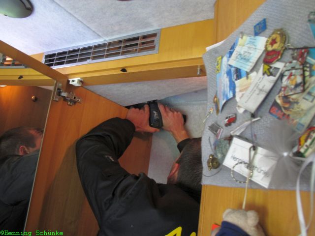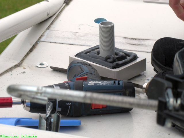 Trotzdem muss den vielen Löchern noch ein weiteres hinzugefügt werden. Hier frisst sich der Bohrer durchs Dach.