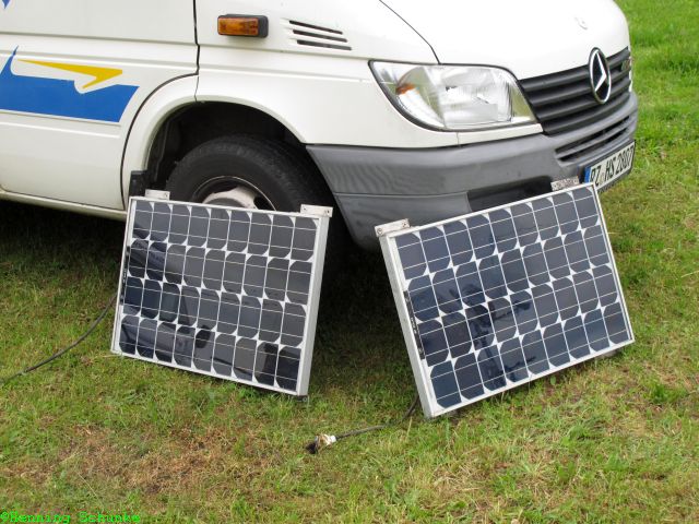 …alle mit jeweils 100 Watt Leistung. Etwa um 15 Uhr waren die auf ca. 75% entladenen Batterien auch wieder voll. Ein kurzer Test mit dem Heizlüfter am Wechselrichter ergab Ladeströme von um die 30 Ampere. Diese Ausstattung sollte mir in der meisten Zeit des Jahres reichen. Bei tiefstehender Sonne im Winter ist ja auch noch der Solarkoffer da und gegen wochenlanges Regenwetter hilft ein Stellungswechsel.