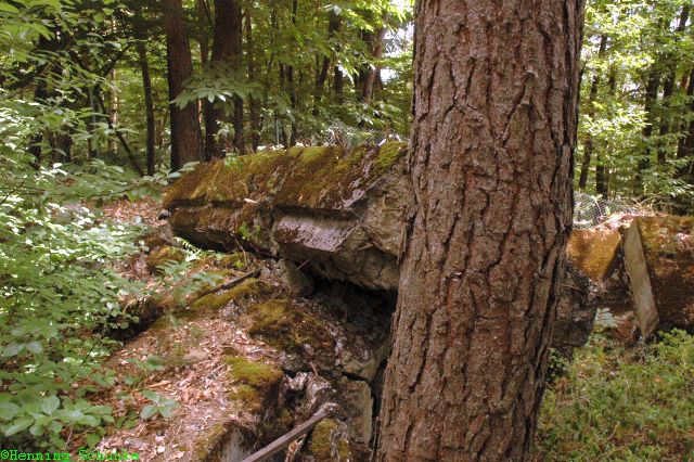 Die Bunker wurden ín der Nachkriegszeit alle gesprengt und teilweise eingeebnet. Was noch zu sehen ist, sind bemooste Betonbrocken im Wald.