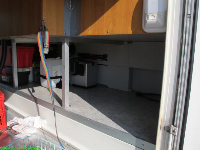 Zwischenboden: Da habe ich auf der linken Seite ein großes und ein kleineres Fach und von innen komme ich an die Tanks dran. Die beiden Aussenstaufächer sind belegt mit dem Solarkoffer, der Aussenabdeckung und den Auffahrkeilen.