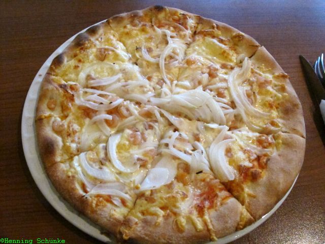Auf dieser finden sich Krabben, Zwiebeln, Knoblauch und Käse.
