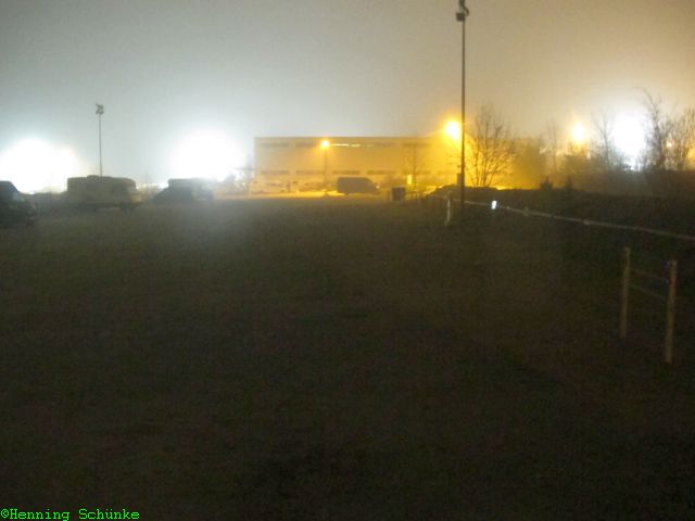 Hier der nächtlich dunkle Stellplatz im Nebel, im Hintergrund das noch immer hell erleuchtete Freistaat-Gelände. Da hat entweder jemand bewußt einen Schalter umgelegt, um die kleine, aber hartnäckige Dauerbewohner-Gemeinde zu vergrämen oder es ist eine Sicherung durchgebrannt. Geblieben ist immerhin das W-LAN.