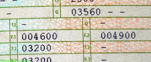 Weit war es auch nicht mehr bis zur Zulassungsstelle in Gut Lanken bei Elmenhorst. Dort habe ich mich mit dem Fahrzeugschein und dem TÜV-Gutachten in die Warteschlange eingereiht. Die für mich zuständige Amtsdame musste für die Änderung drei Mal Hilfe von einem Kollegen holen, aber schließlich konnte ich, nach Zahlung von 11,70€, wieder von dannen ziehen. Dann habe ich mir meinen Fahrzeugschein einmal genauer angesehen. Aber was ist das? Da steht ja immer noch 4600!