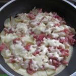 Dann Kartoffeln und die in Scheiben geschnittene Zwiebel hinein geben.