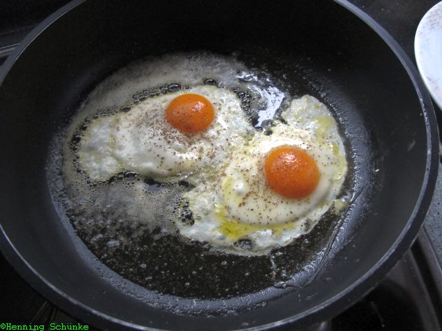 Spiegeleier sind natürlich keine Raketenwissenschaft, trotzdem nicht weglaufen vom Herd. Lieber mit Salz und Pfeffer würzen, die Kartoffeln auf dem Teller drapieren und die Eier darüber.