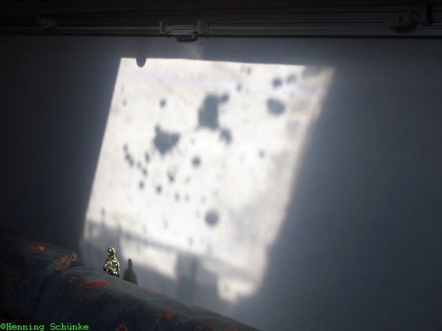 Heute morgen sah schon der Schatten der großen Dachluke über dem Tisch komisch aus. Hier zu sehen am geschlossenen Rollo des Seitenfensters: