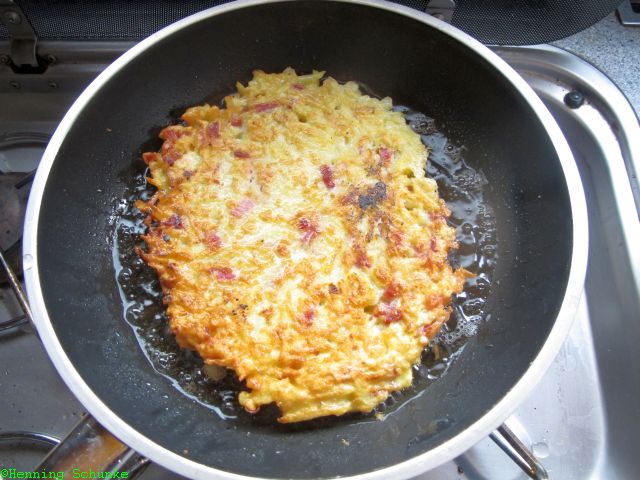 Die Kartoffeln schälen, waschen und reiben, ein bis zwei rohe Eier darüber schlagen und alles verrühren. Jetzt Mehl dazu geben, bis die Masse fest wird. Das Mehl nimmt die Flüssigkeit der Kartoffeln und der Eier auf. Jetzt den Teig mit Pfeffer und Salz würzen.