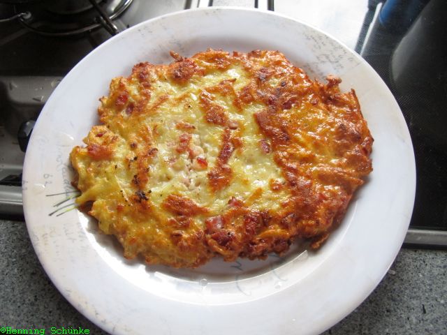 Ich habe noch zwei kleine, gehackte Zwiebeln und Speckwürfel in den Teig gerührt.