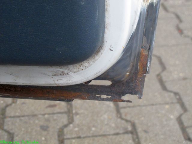 Besonders unten an der Ecke der Beifahrertür, hier nachdem aller Rost entfernt war. Inzwischen ist das geschweißt und lackiert. An der Fahrertür an gleicher Stelle zeigte sich die braune Pest auch schon, nur noch nicht so weit fortgeschritten. Aber auch das ist wieder rostfrei und mit frischer Farbe versehen.