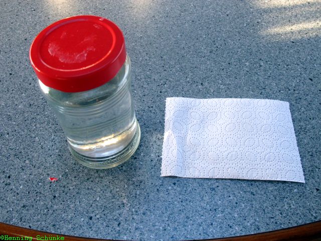 Ein Marmeladenglas, gefüllt mit Wasser aus meinem Tank ohne irgendwelche Zusätze und ein Blatt ordinäres Recycling-Klopapier, wie man es zum Beispiel bei Lidl kaufen kann.