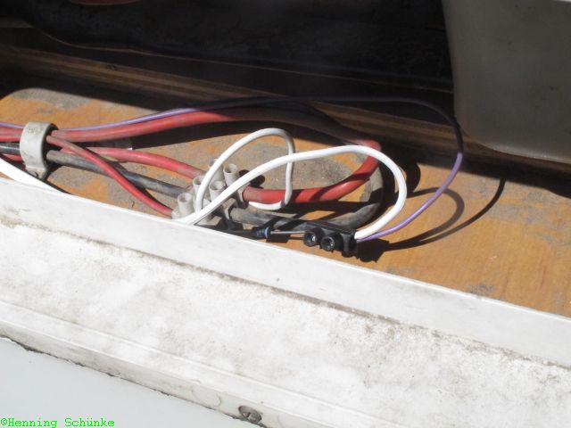 So habe ich Andre am Sonntag gefragt, wie viel Aufwand es wohl ist, den Kühlschrank mit Solarstrom laufen zu lassen, wenn die Batterie voll ist. Nach Studium von ein paar Schaltplänen war schnell klar, dass wirklich eine Leitung reicht. Hier ist diese schicke, neue, weiße Leitung…