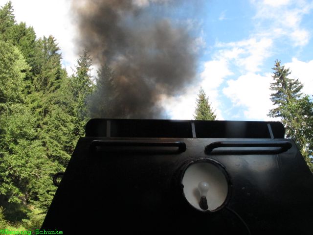Den dabei entstehenden Grobstaub kann man locker abhusten und später aus den Haaren bürsten. Nach erneutem Umsetzen der Lok in Stiege ergab sich von der Plattform des letzten Wagens wieder ein Blick über die Hochflächen des Harzes…