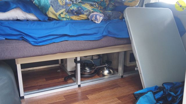 Hier ist die eine Hälfte des Bettes fix, die zweite kann rausgeschoben werden, so dass dann der gesamte Laderaum belegt ist. Ich muss also nichts tun, da ich ja alleine unterwegs bin und liege einfach die ganze Zeit auf zwei übereinanderliegenden Matratzen.