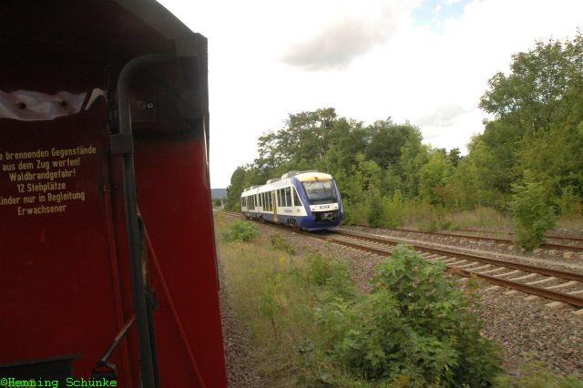 Diese Lok brachte uns nach Quedlinburg. Kurz vor dem Ziel kam es zu einer fliegenden Überholung durch den Triebwagen des Harz-Elbe-Express (HEX)…