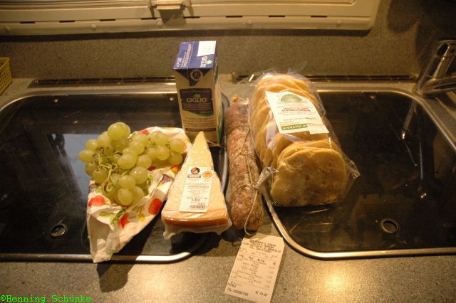 Der hatte leider kein Brot und nur H-Milch, dafür Parmesankäse und eine Salami. Meine insgesamt bescheidene Ausbeute…