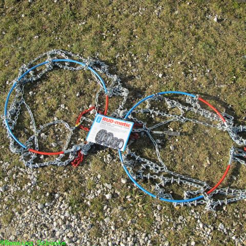 Gekauft habe ich die RUD-Ketten für den alten Benz, aber nie benutzt. Weil der 225er Reifen hatte und das aktuelle Mobil auf 195ern daherrollt, war ich mir nicht sicher, ob die Ketten passen. Auch sollte ich vor einer Alpenüberquerung im Dezember das zumindest einmal geübt haben. Natürlich will ich nicht über dick verschneite Pässe, aber man kann ja nie wissen.