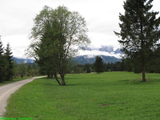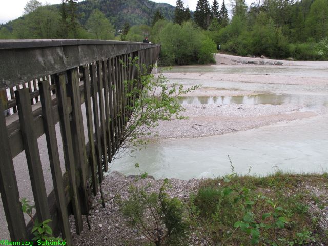 vor allem von oben kam heute das Wasser. Erst am späten Nachmittag hat der Regen wieder aufgehört, gerade rechtzeitig zum Erwerb einen neuen Parkscheins. Denn trotz des Wetters gefällt es mir hier, der Platz ist schön ruhig, bis auf gelegentliches Kuhglockengebimmel und die Luft ist gut. Es kommen auch immer wieder unentwegte, wetterfeste Mobilisten vorgefahren. Weil ich mich ja bewegen wollte, bin ich also nach dem Kauf des Parkscheins losgestiefelt. Ins Bett der Isar…