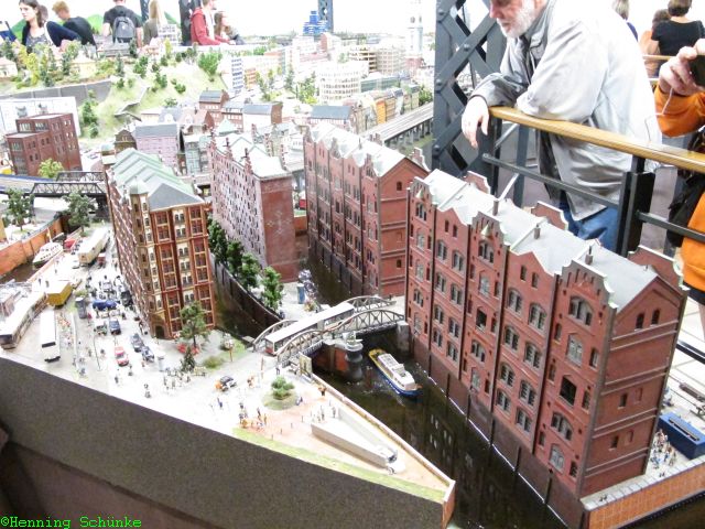 Rechts im Vordergrund der Speicher am Kehrwieder-Fleet, in dem sich das Miniatur-Wunderland befindet. Darin fährt natürlich…