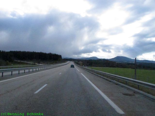 …aber auch bergiger, immerhin geht es jetzt ins Zentralmassiv. Die Straße ist meistens vierspurig ausgebaut…