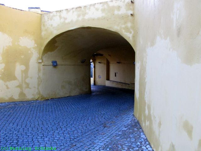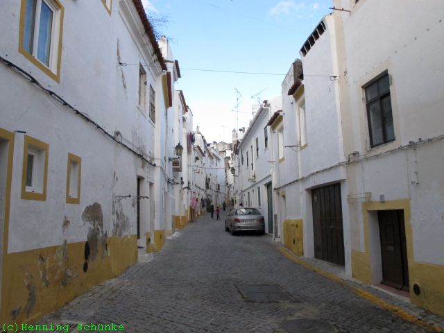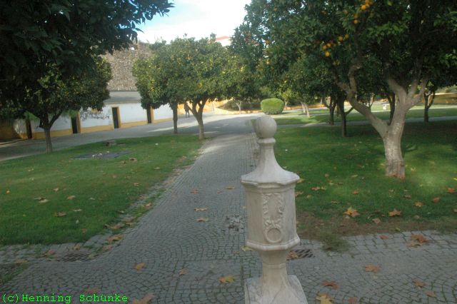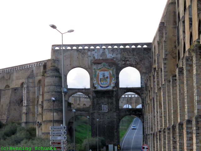 …sind noch erhalten und geben der Stadt ihre charakteristische Gestalt. Elvas war vor allem Grenzfestung gegen die Spanier. Allerdings, ich, als alter Digital-Stratege, hätte meine Festung nicht an eine so offensichtliche Nabelschnur wie dieses Aquädukt gehängt. Wenn der böse Feind das kaputt macht, braucht er nur zu waren, bis die Belagerten auf der Suche nach Wasser ganz von selbst heraus kommen. Ich weiß, wovon ich rede, schließlich habe ich kaum eine virtuelle Schlacht in den veschiedensten Strategiespielen jemals verloren. Aber vermutlich hatte man hier Mittel und Wege das Aquädukt wirksam zu schützen, schließlich steht es heute noch.