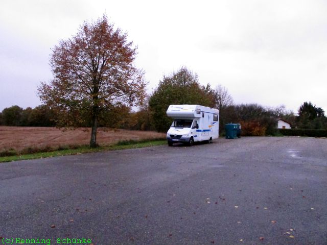 Aber der Regen hätte meistens für Regentropfen oder Wischerarme auf den Windschutzscheibenfotos gesorgt, deswegen gibt es kaum welche. Aus der N83 wurde die D1083, aber die Richtung war gleich: Südwestlich nach Lyon und durch Bourg-en-Bresse. Vor Lyon liegt der berühmte Vogelpark von Villars-les-Dombes, dessen Parkplatz wohl von vielen auf dem Weg nach Spanien als Durchgangsstation benutzt wird. Ich bin aber kurz davor abgebogen, weil meinwomo.net einen Stellplatz auf dem Dorf in Le Plantay ebenfalls empfohlen hat.