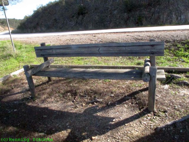 Auf einer erneuten Wanderung, diesmal mit sechs Beinen weniger, weil Tanja und Tizon nicht dabei sind, kommen wir an einer Bank mit Konstruktionsfehler vorbei.