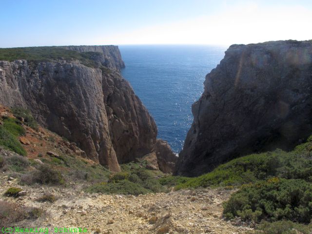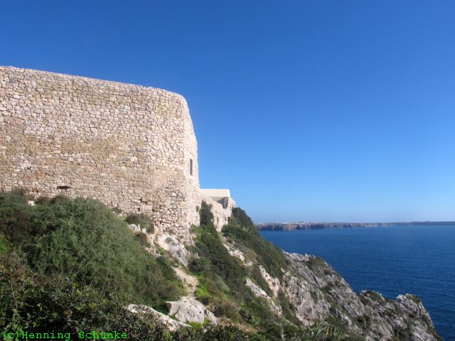…der Mauer von der anderen Seite ist nichts Aufregendes zu sehen. Ein Tor ist mit einer dicken Eisenkette verschlossen. Irgendwie sieht das privat aus, aber Wikipedia weiß es besser: Wikipedia – Fortaleza de Belixe. Demnach ist hier alles abgesperrt wegen der erodierenden Klippen. Schließlich soll der neugierige Tourist nicht über achtzig Meter tief in den Atlantik purzeln, Danke für die Fürsorge. Na gut, also wieder zurück.
