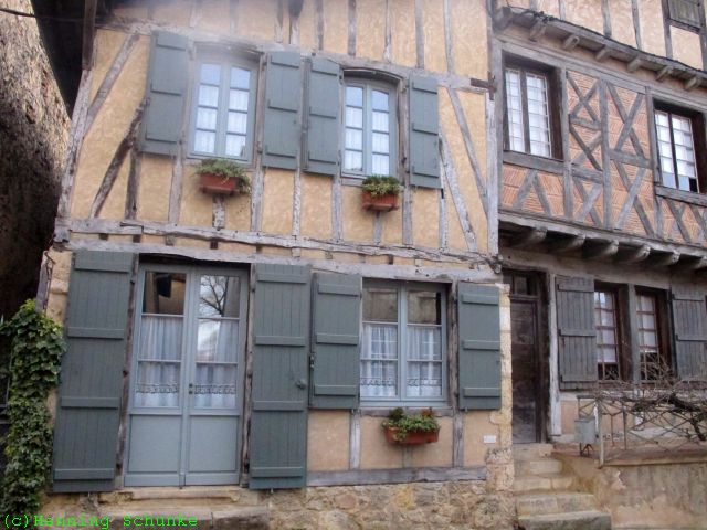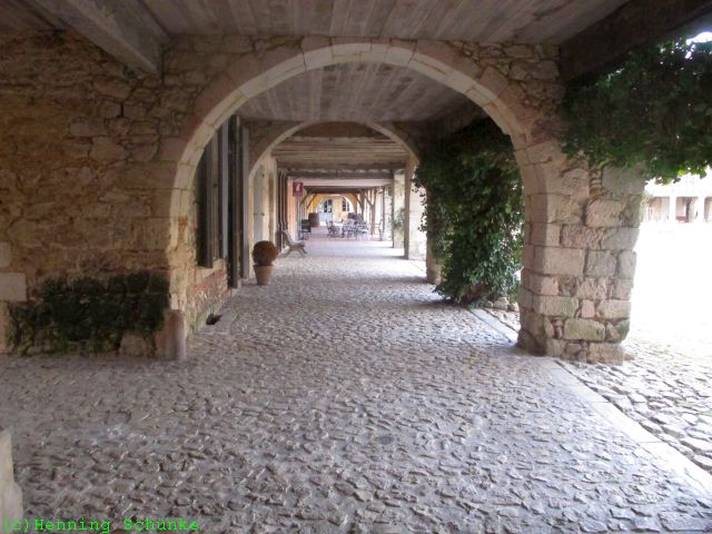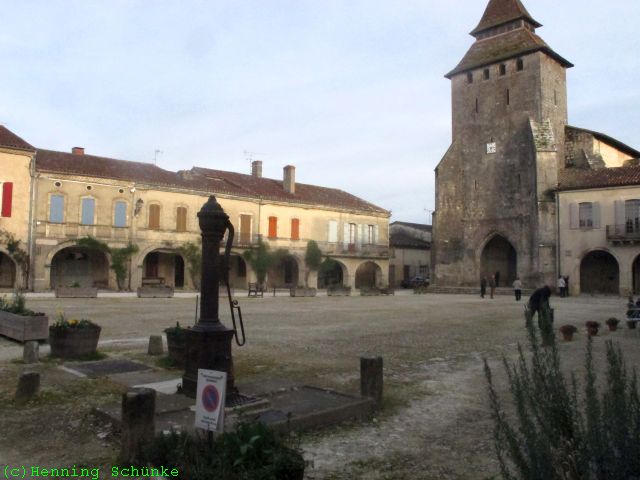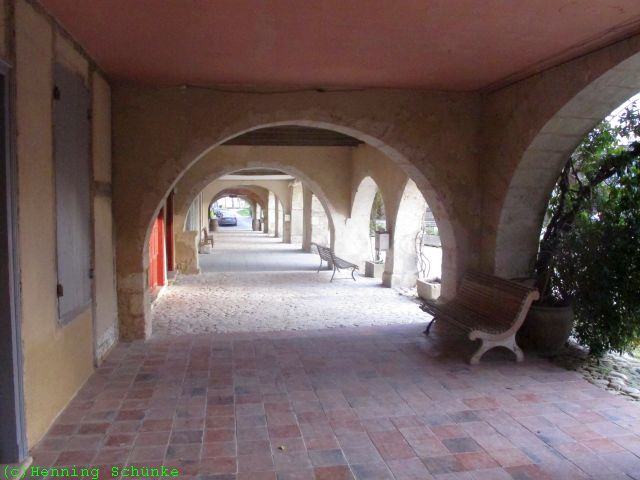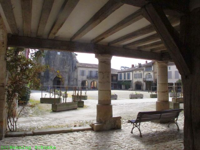 Richtig, aber hier ist Aquitanien und diese Gegend kam nach der Hochzeit der Eleonore von Aquitanien mit Heinrich Plantagenet, Graf von Anjou, zu England. Genauer 1154, da bestieg jener Heinrich als Heinrich II. den englischen Thron und erhob Anspruch auf weite Teile Frankreichs, eben auch Aquitanien, die Mitgift seiner Frau. Das hat natürlich dem französischen König nicht geschmeckt und so kam es zum Hundertjährigen Krieg zwischen England und Frankreich. In diesen unruhigen Zeiten gründeten sowohl die Franzosen, als auch die Engländer vor allem im Südwesten des heutigen Frankreich sogenannte „Bastiden“, die man auch als Wehrdörfer ansehen konnte. Bis heute gibt es über 400 solche, als Bastiden gegründete Ortschaften, wie zum Beispiel Carcassonne, Montauban und eben das winzige Labastide d’Armagnac. In solchen Bastiden verlaufen die Straßen rechtwinklig zueinander und der zentral gelegene Marktplatz ist von Arkaden umgeben. So gesehen ist dies hier wohl eine Muster-Bastide. In der ehemaligen protestantischen Kirche beim Friedhof ist darum auch ein Museum zur Geschichte der Bastiden untergebracht.