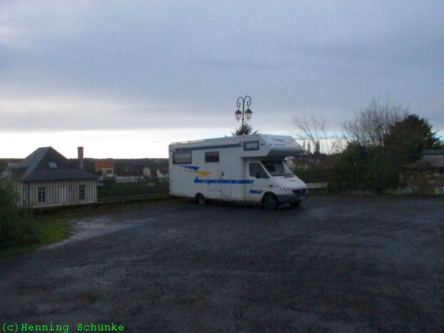 am Dienstag hat mich das Geräusch des Regens geweckt und so ging es auch den ganzen Tag weiter. Also sind von der Fahrt auf der N21 Richtung Limoges keine vorzeigbaren Windschutzscheibenbilder überliefert. Ich hatte mir das Städtchen Bellac als Etappenziel herausgesucht. Laut meinwomo hat man dort allein drei Stellplätze. Ich wollte möglichst dicht ans Zentrum, um dort nach einem Geldautomaten zu fahnden. 200m vor dem Ziel, schon in einer engen Innenstadtstraße, setzten dann aber eine Arbeitsplattform zur Linken und eine ausgefahrene Ladenmarkise rechts meinem weiteren Vorwärtsdrang ein Ende. Da wäre ich nicht durch gekommen, ohne größeren Flurschaden anzurichten. Katrin Becker hatte kurz vorher verkündet, dass ich nach 300 Metern mein Ziel erreicht hätte. Deshalb hat sie auch eisern geschwiegen, nachdem ich gewendet und zur Hauptstraße zurück gefahren bin, um einen anderen Weg zu dem Parkplatz mit Wohnmobilecke zu suchen. Parkplätze waren auch einige ausgeschildert, nur keine Stellplätze. Schließlich habe ich ein nicht näher beschildertes Eckchen gefunden, sogar mit Aussicht über das Tal.