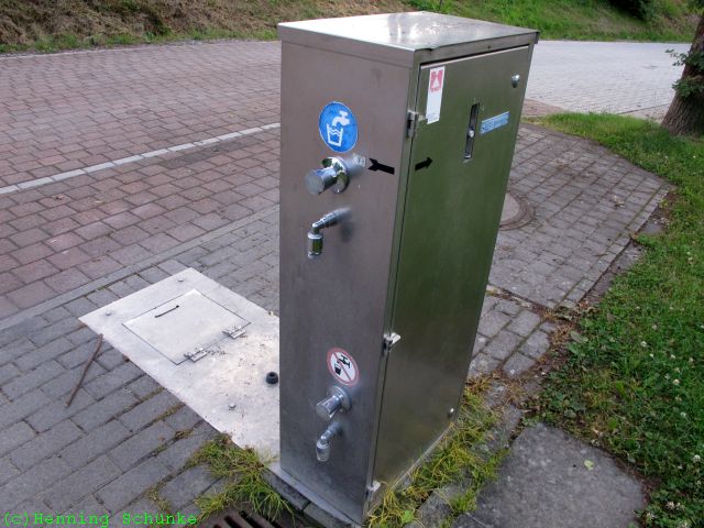 Der untere Wasserhahn ist zur Spülung der Kassette gedacht, hier habe ich in Poppenhausen einmal Wasser bekommen und einmal nicht, vermutlich geht der auch nur, wenn man oben Geld einwirft.